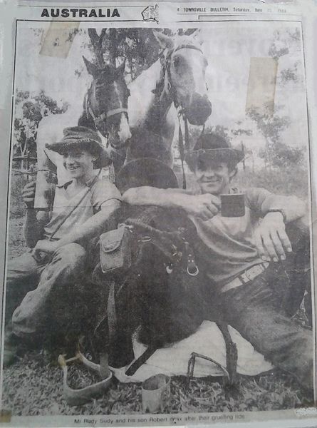 Townsville Bulletin, June 1988: “Rudy Sudy and his son Robert” arriving home to Townsville after spending a whole month in the saddle. They first rode 450km up to Malanda, to join 200 other riders reenacting a pack horse mail run from the ghost town of Maytown in the Palmer River Goldfields. After setting up a makeshift post office, pack horses carried the mail bags another 400km to Cooktown, arriving 10 days later for the Bicentennial Festival, and after the reenactment, they rode the 450km back to Townsville, clocking up over 1300km.