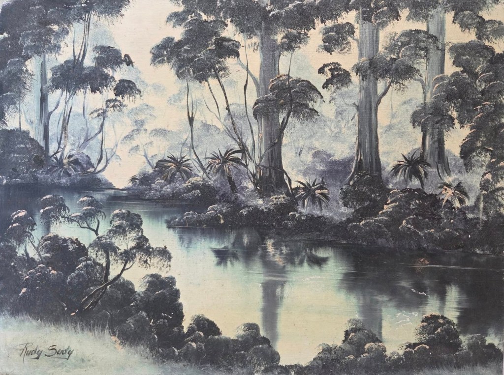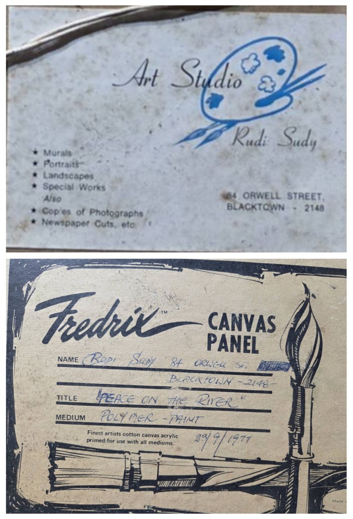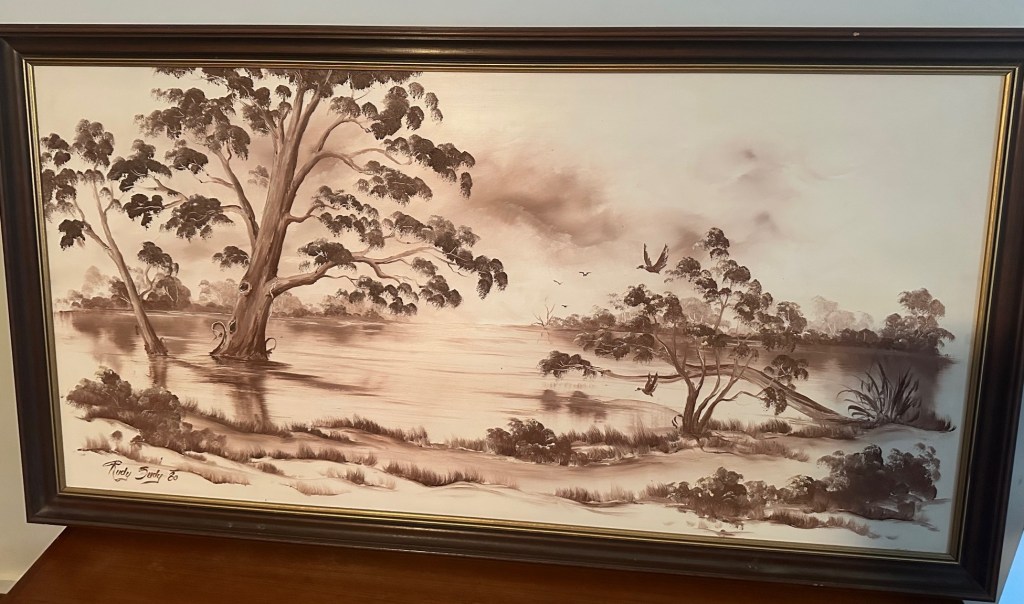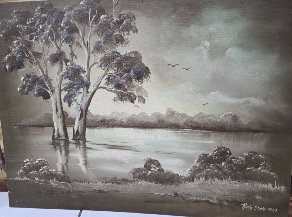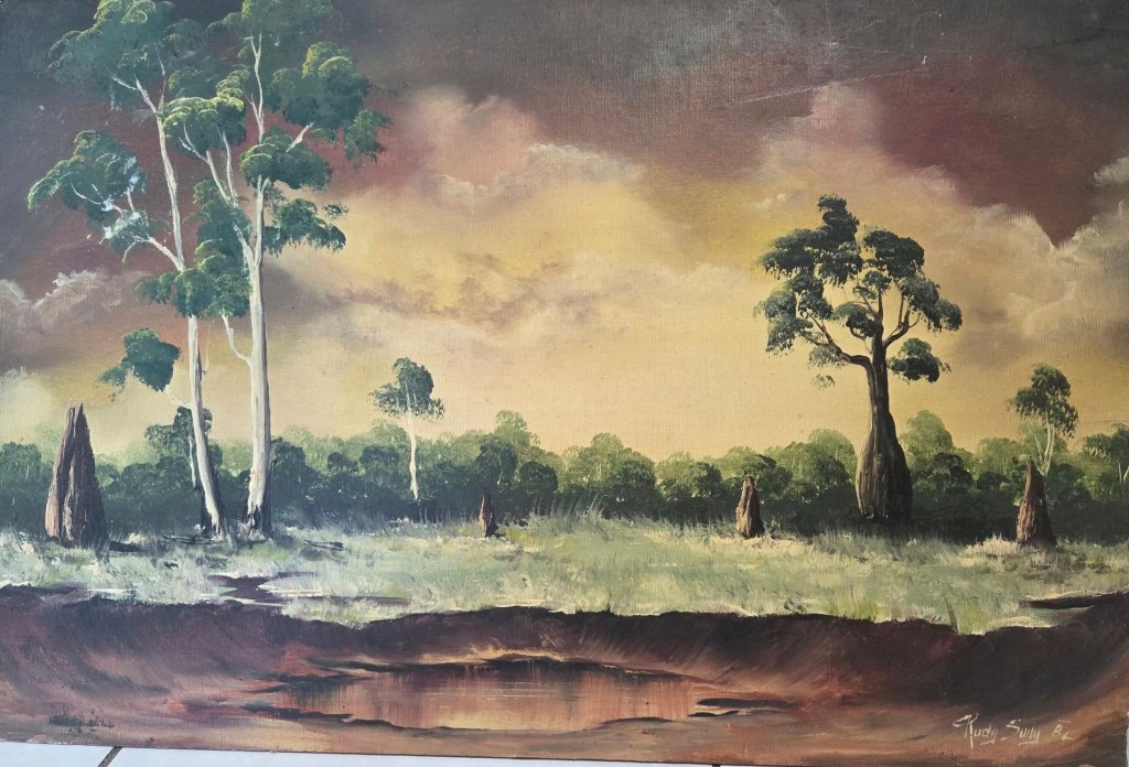 Waterfall on the river 2000Iconic Rudy Sudy 15 minute sepia landscape 1980’sIconic Rudy Sudy 15 minute “Wood Art”. (top early 1980’s, bottom late 1980’s)Painted from a photo of a rodeo in Laura, Far North Queensland.Australian Alps sceneWaterfall & White Swans 1986Mannum South AustraliaThe Big Strawberry in Koonoomoo, VictoriaGecko’s Rest Backpackers Mackay, QueenslandTimber guitar case painted in Grafton 2000An early Australian outback piece, painted in 1980.Florence writes: “I met Rudy in 1990 Rockhampton when I joined a speed painting course he was doing. I have very fond memories of Rudy and still have my certificate & book of notes for each painting we did in class. Afterwards I made him a suede vest for a entertainment act of fire eating/breathing he was doing.”Riverina scene in sepia, 1980Portrait of Marian and Horrie Woods Dachshund “Mandy”, 1980.Townsville, Castle Hill and the Sugar shaker.Darling River in floodThe KimberleyTropical lagoonOutback farmhouseOne of Rudy Sudy’s first Australiana paintings, 1977One of Rudy Sudy’s first Australiana paintings, 1977Rudy Sudy’s first art studio at Blacktown, 1977.
